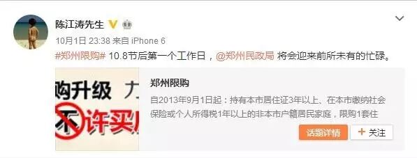 看了郑州新限购令,新浪微博实名认证为“郑州鑫先贸易有限公司总经理”的陈江涛这样说,“10.8节后第一个工作日,郑州民政局将会迎来前所未有的忙碌。”