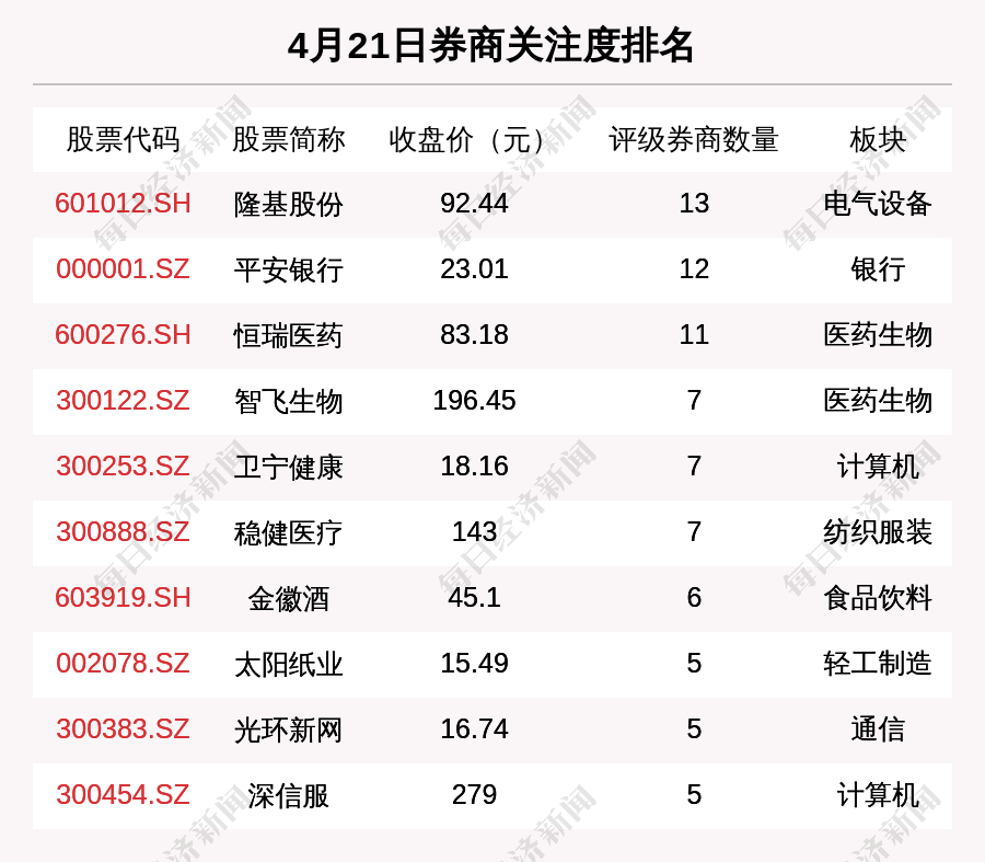 从券商对个股的关注程度来看,有68只个股获得多家券商关注,券商关注数量排名居前的个股是隆基股份(601012.SH)、平安银行(000001.SZ)、恒瑞医药(600276.SH)。