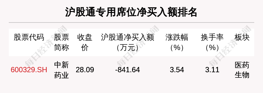 在龙虎榜中,涉及沪股通专用席位的个股有1只,中新药业的沪股通专用席位净卖出额最大,净卖出841.64万元。
