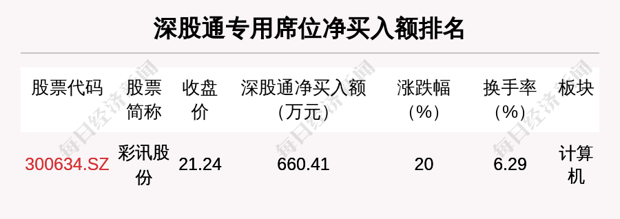 在龙虎榜中,涉及深股通专用席位的个股有1只,彩讯股份的深股通专用席位净买入额最大,净买入660.41万元。