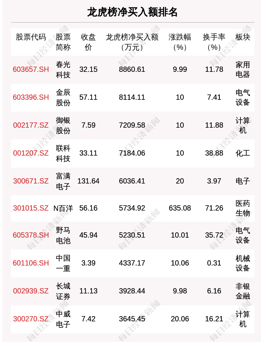 在龙虎榜中,涉及机构专用席位的个股有21只,净买入额前三的是春光科技、永太科技、兴齐眼药,分别为1.01亿元、7855.86万元、5669.15万元。