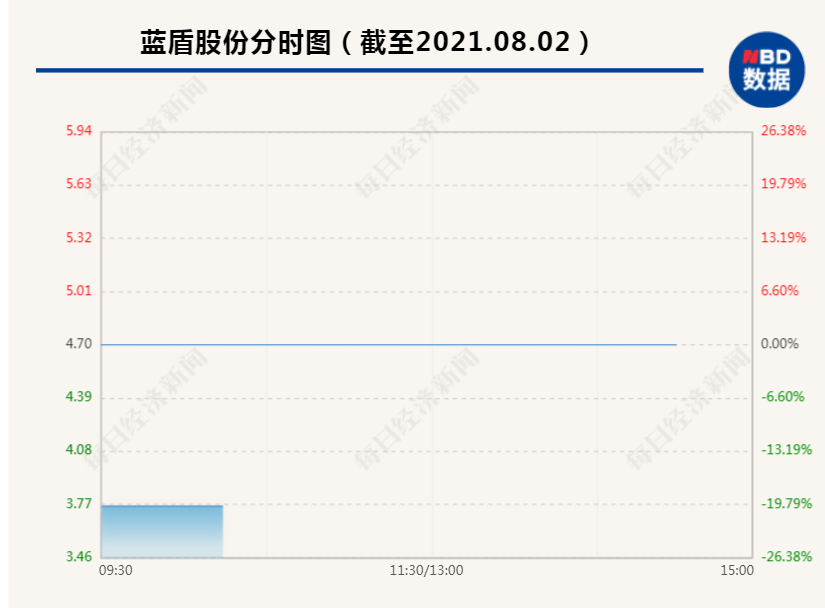 8月2日,蓝盾股份(300297.SZ)开盘一字跌停,截至发稿,蓝盾股份报3.76元/股,总市值47亿元。