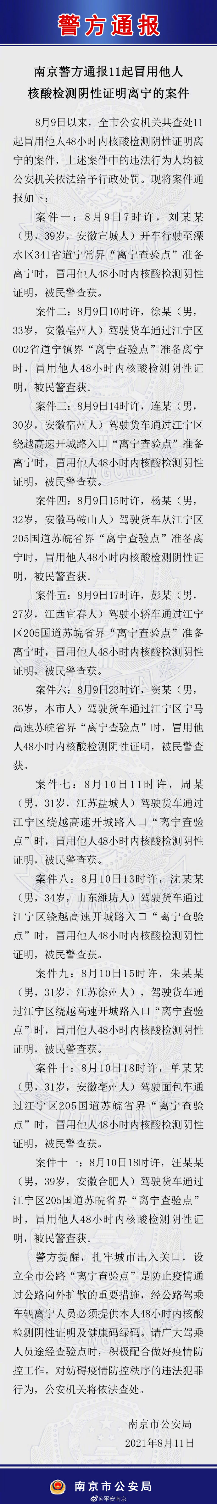 “平安南京”官方微博11日晚间发布通报称,8月9日以来,南京市公安机关共查处11起冒用他人48小时内核酸检测阴性证明离宁的案件,上述案件中的违法行为人均被公安机关依法给予行政处罚。现将案件通报如下: