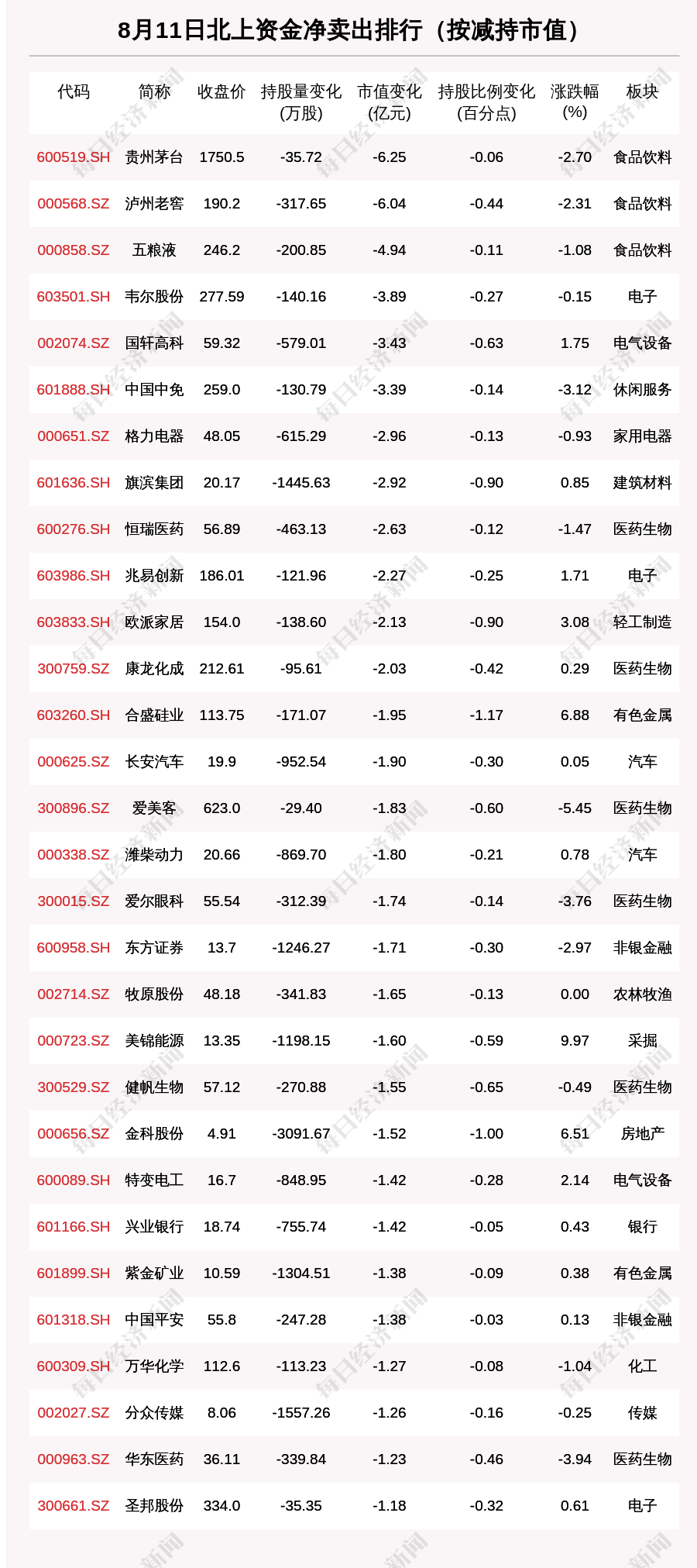 北向资金动向曝光:8月11日这30只个股遭大甩卖(附名单)