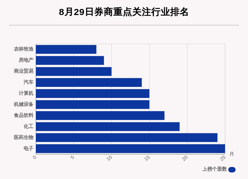 从券商对行业的关注度来看,券商关注个股数居前的行业分别是电子、医药生物、化工。