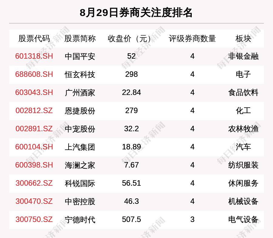 从券商对个股的关注程度来看,有59只个股获得多家券商关注,券商关注数量排名居前的个股是中国平安(601318.SH)、恒玄科技(688608.SH)、广州酒家(603043.SH)。