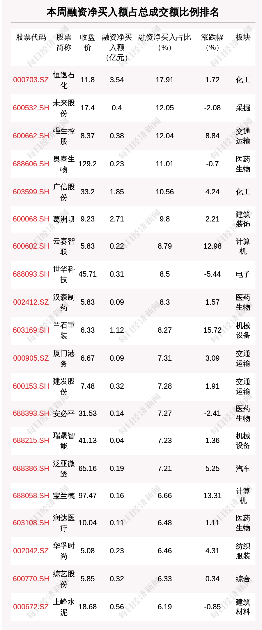 两市共有5只股票融资净买入额占总成交金额比例超10%,其中恒逸石化、未来股份、强生控股排名前三,占比分别为17.91%、12.05%、12.04%。