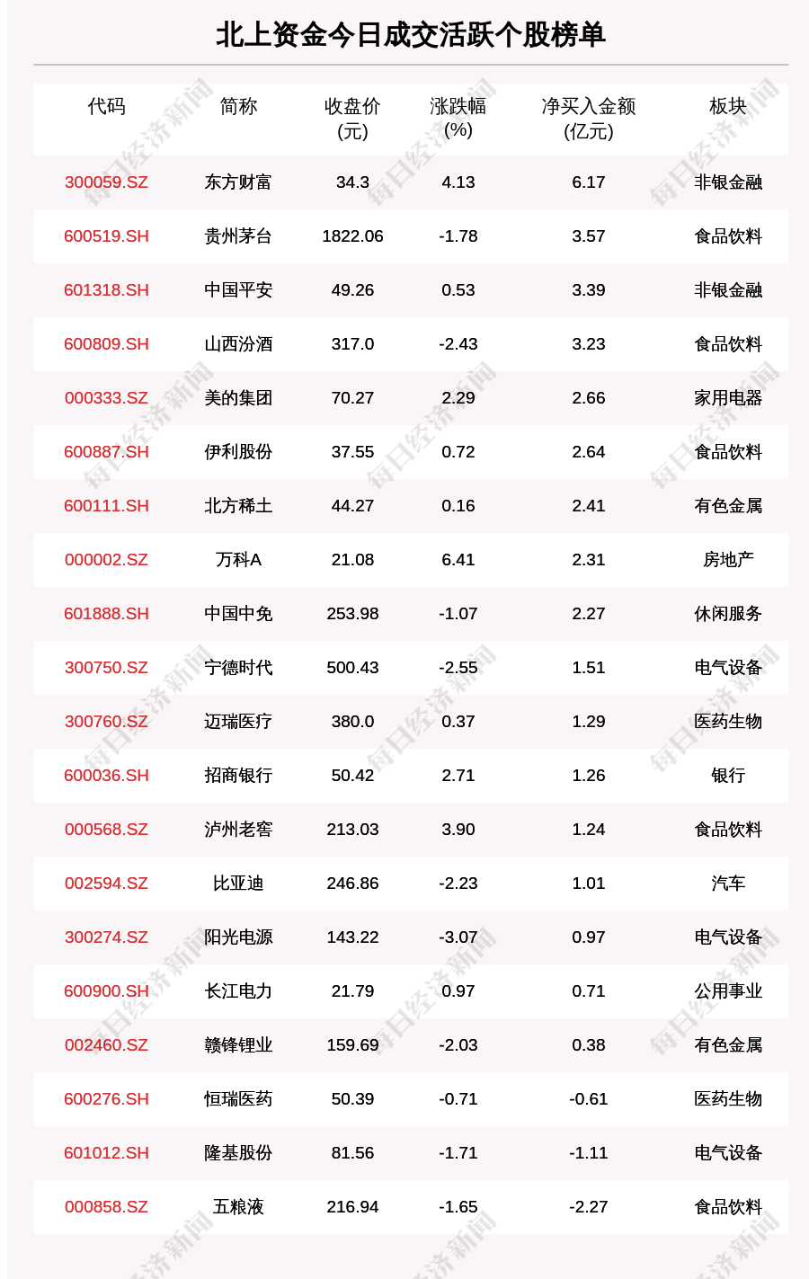 9月28日,北上资金成交活跃个股榜单中,净买入个股共17只,金额最多的是东方财富(300059.SZ,收盘价:34.3元),净买入6.168亿元;净卖出个股共3只,金额最多的是五粮液(000858.SZ,收盘价:216.94元),净卖出2.275亿元。