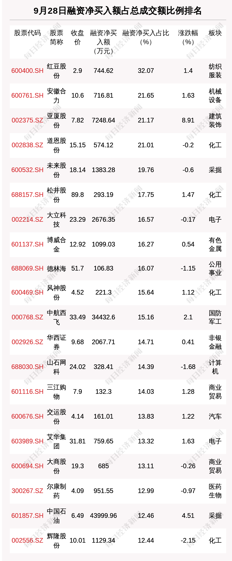 9月28日两市共有904只个股有融资资金净买入。共有39只股票融资净买入额占总成交金额比例超10%,其中红豆股份、安徽合力、亚厦股份排名前三,占比分别为32.07%、21.65%、21.17%。
