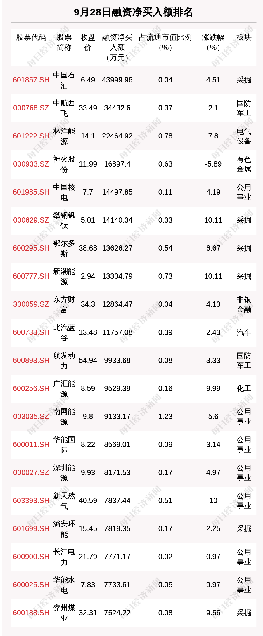 从融资资金净买入金额来看,共有10只个股净买入金额超亿元,其中中国石油、中航西飞、林洋能源排名前三,买入金额分别为4.4亿元、3.44亿元、2.25亿元。