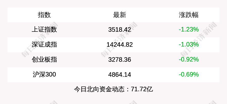 每经AI快讯:上证指数收盘下跌43.89点,跌幅为1.23%,报收3518.42点,成交额5029.83亿元;深证成指收盘下跌148.69点,跌幅为1.03%,报收14244.82点,成交额6047.08亿元;创业板指收盘下跌30.6点,跌幅为0.92%,报收3278.36点,成交额2236.67亿元;沪深300收盘下跌34.02点,跌幅为0.69%,报收4864.14点,成交额3166.32亿元。北上资金当日净流入71.72亿元。