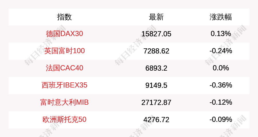 每经AI快讯:北京时间11月2日16:00,德国DAX30指数开盘上涨20.76点,涨幅为0.13%,报15827.05点;英国富时100指数开盘下跌17.83点,跌幅为0.24%,报7270.79点;法国CAC40指数平开,报6893.2点;西班牙IBEX35指数开盘下跌33.1点,跌幅为0.36%,报9149.5点;富时意大利MIB指数开盘下跌33.13点,跌幅为0.12%,报27172.87点;欧洲斯托克50指数开盘下跌3.75点,跌幅为0.09%,报4276.72点。
