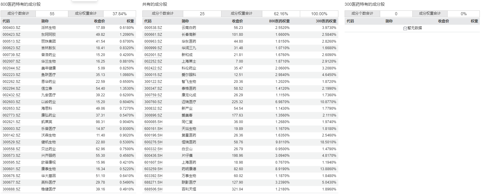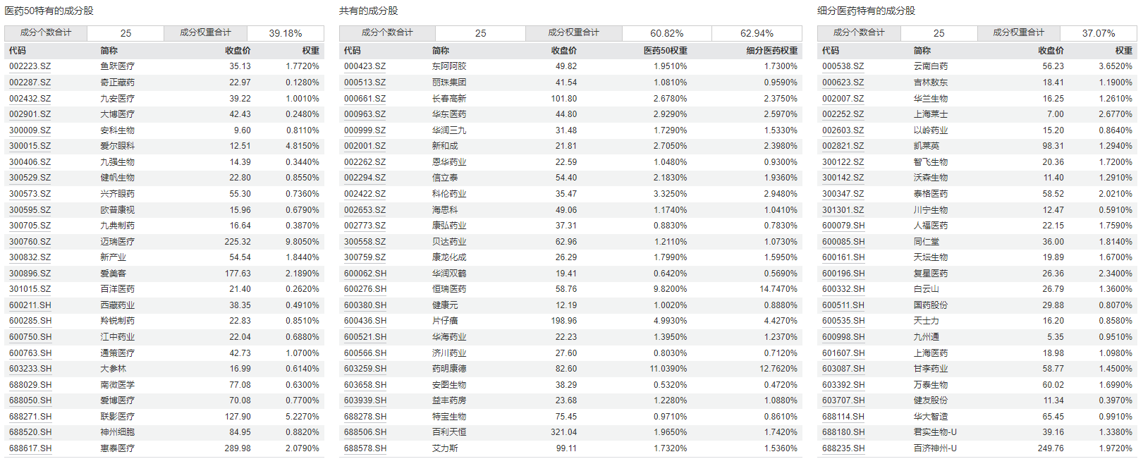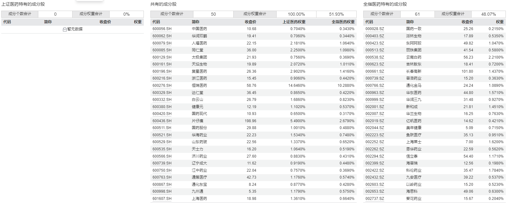 对比两个指数成分股,中证全指医药卫生指数的111只成分股,完全涵盖了上证医药卫生行业指数的50只成分股。