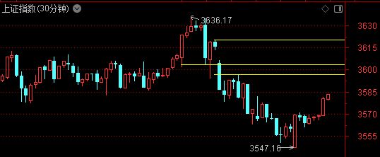 上方阻力方面,上周四的文章提到,阻力位在3595点附近,再上方的两个阻力位依次是3601点附近、3620点附近,如下图所示的上证指数30分钟K线图: