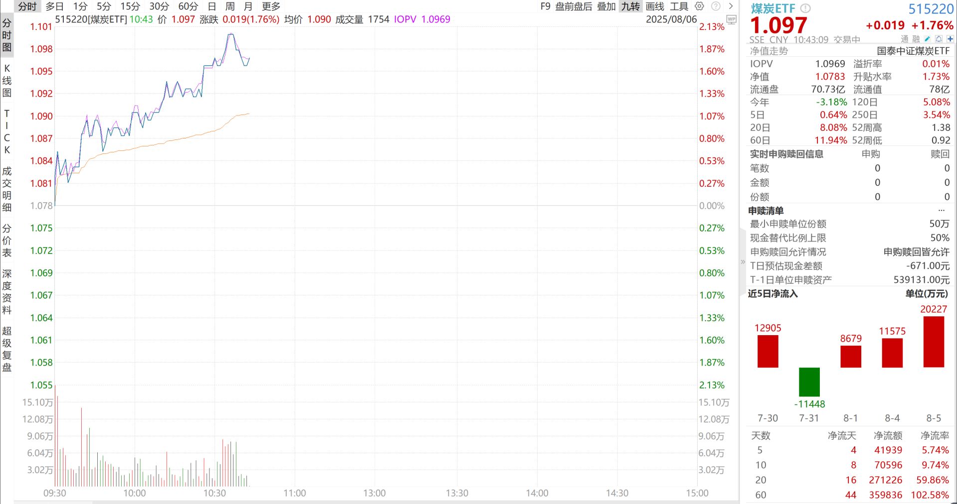 焦煤价格持续上涨,煤炭ETF(515220)盘中涨超2%