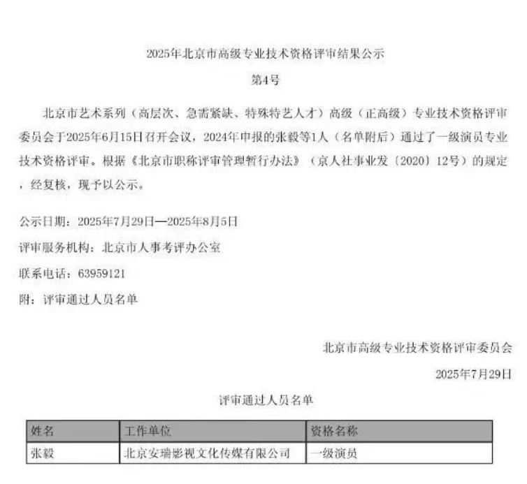 据长安街知事,7月29日,北京市高级专业技术资格评审委员会发布公示,张译(公示名“张毅”)通过一级演员(正高级职称)专业技术资格评审。