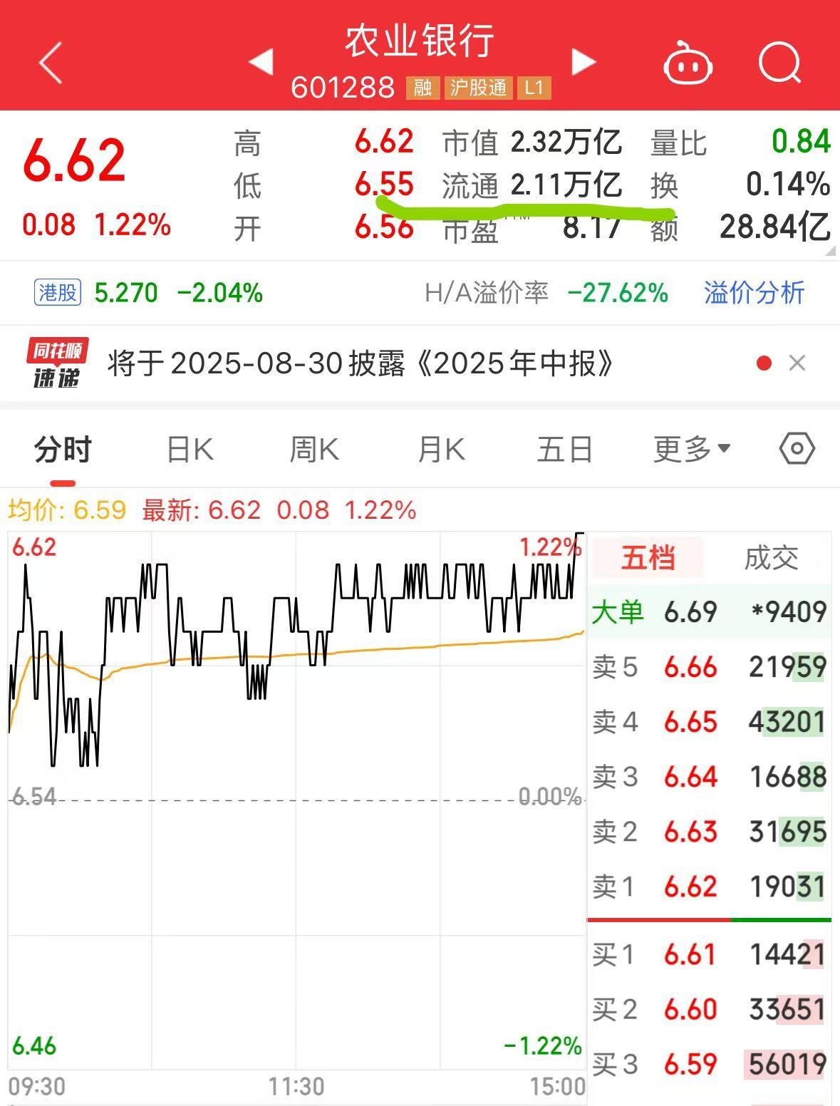 8月6日,今日农业银行收盘上涨1.22%,最新收盘价6.62元/股,再创历史新高,公司A股流通市值升至2.11万亿元。