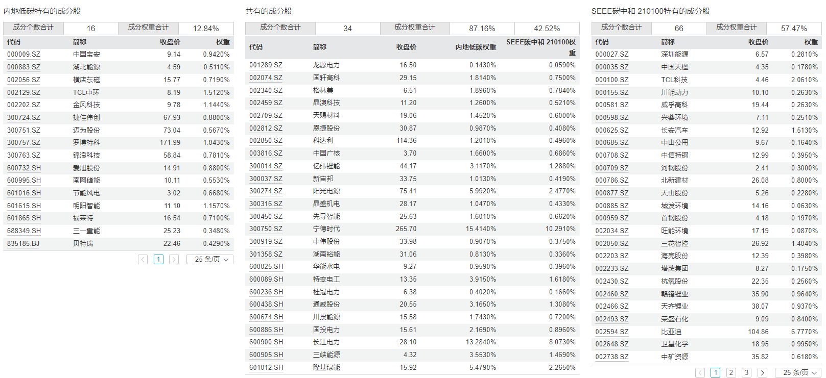 进一步对比两个指数的成分股,可以发现重合的成分股共有34只,中证内地低碳经济主题指数独有的成分股有16只,中证上海环交所碳中和指数独有的成分股有66只。