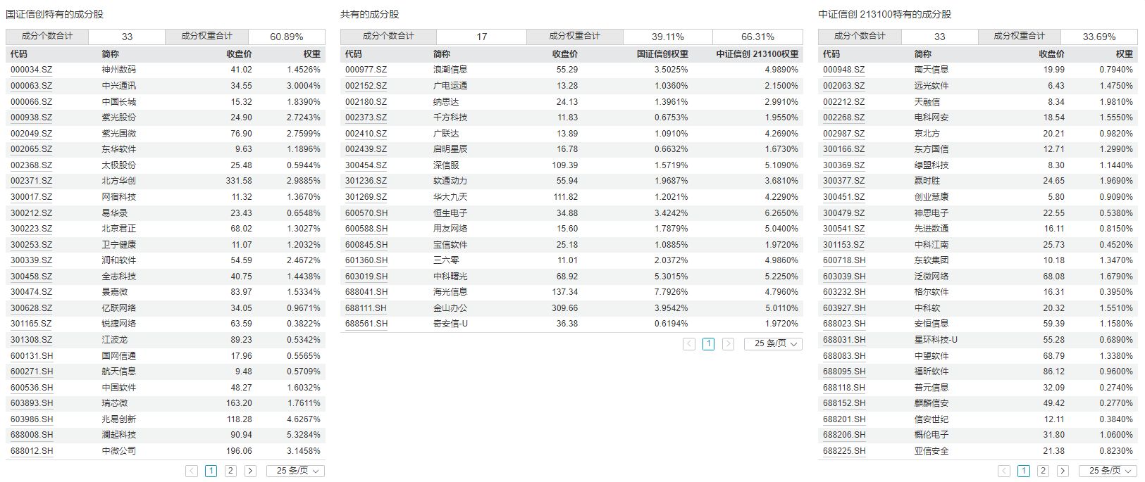 进一步对比两个指数的成分股,可以发现两个指数共同的成分股只有17只,各自独有的成分股均是33只。