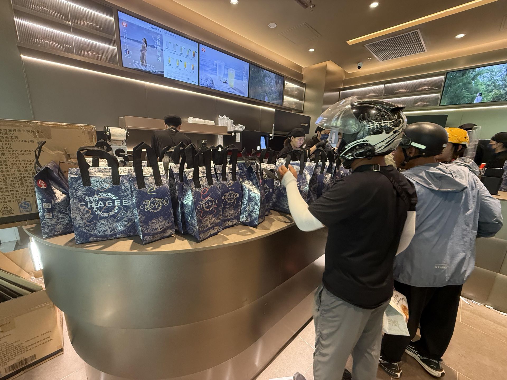 霸王茶姬门店中有大量外卖订单和前来取单的骑手(图片来源:每经记者 赵雯琪 摄)