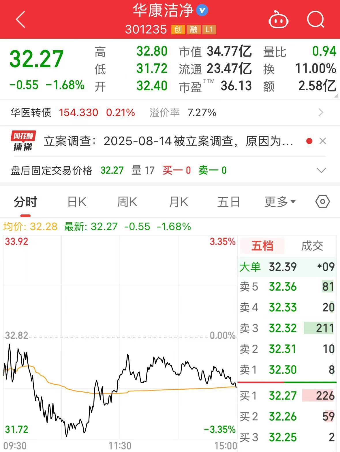 盘面上,截至8月13日,华康洁净股价报收32.27元/股,总市值34.8亿元。