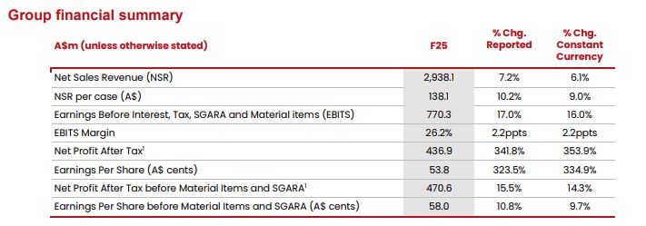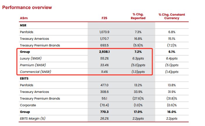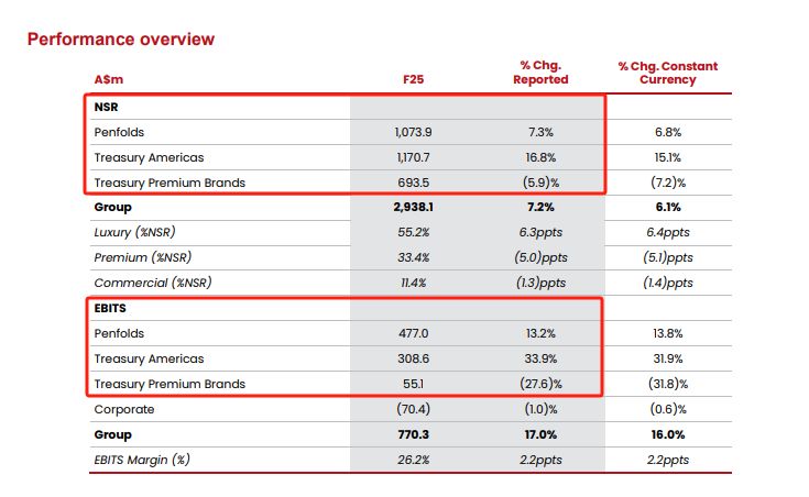 具体来看,作为高端葡萄酒的代表品牌,奔富在2025财年净销售收入约为10.74亿澳元,增长7.3%;EBITS增长13.2%至4.77亿澳元。