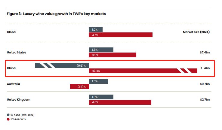 《每日经济新闻·将进酒》记者注意到,在富邑集团高端葡萄酒的关键增长市场中,过去五年,高端葡萄酒在中国市场的年均复合增速为-9.6%。不过,随着奔富重返中国市场,2024年高端葡萄酒在中国市场的增长达到43.4%,远高于2024年全球、美国市场、英国市场的增速。