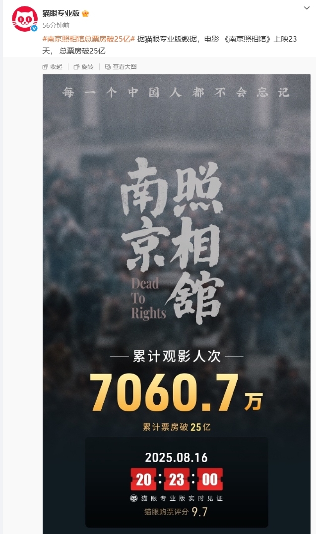 据猫眼专业版数据,截至8月16日,电影 《南京照相馆》上映23天, 总票房破25亿元,观影人次破7000万。