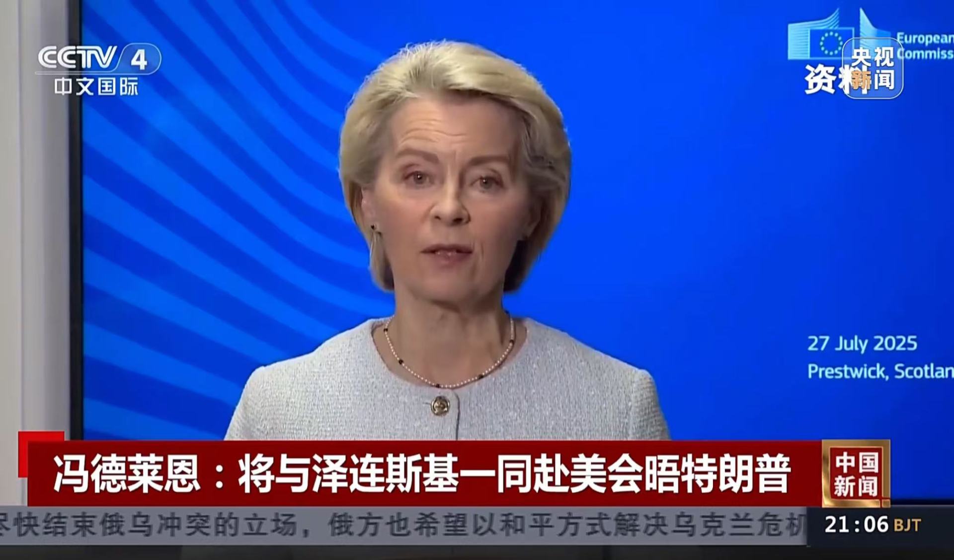 冯德莱恩表示,她欢迎泽连斯基的到访,欧盟将与乌克兰继续合作,实现尊重乌克兰以及欧洲重要安全利益的公正和平。