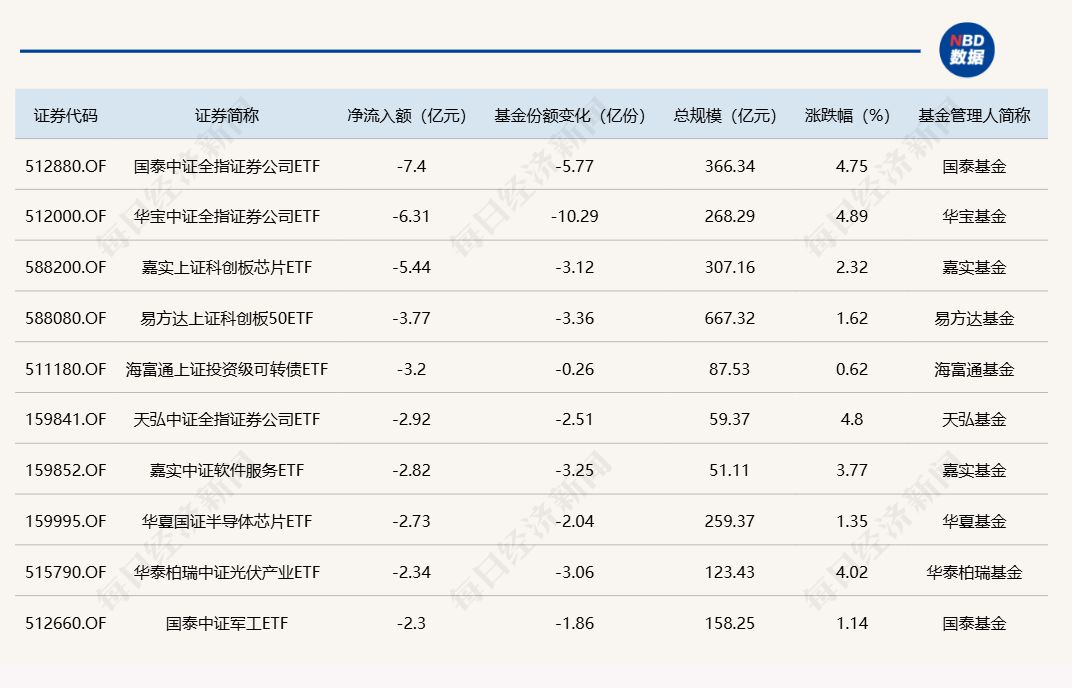 与此同时,国泰中证全指证券公司ETF份额减少5.77亿份,净流出额为7.4亿元;华宝中证全指证券公司ETF份额减少10.29亿份,净流出额为6.31亿元;嘉实上证科创板芯片ETF份额减少3.12亿份,净流出额为5.44亿元。