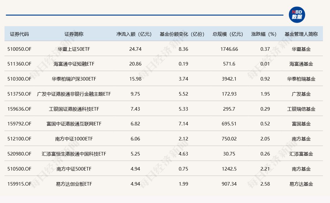 ETF规模速报 | 上证50ETF净流入近25亿元;证券ETF净流出7.4亿元