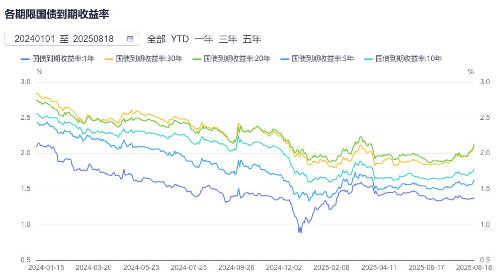 8月18日,股债市场进一步上演“冰火两重天”——上证指数一路高歌,突破3700点,而各期限利率债集体“飘绿”。10年期国债活跃券到期收益率较上个交易日上涨约2.5BP(基点),进一步向1.80%逼近;30年期国债活跃券到期收益率也上破2.0%,较上个交易日上涨超4BP。