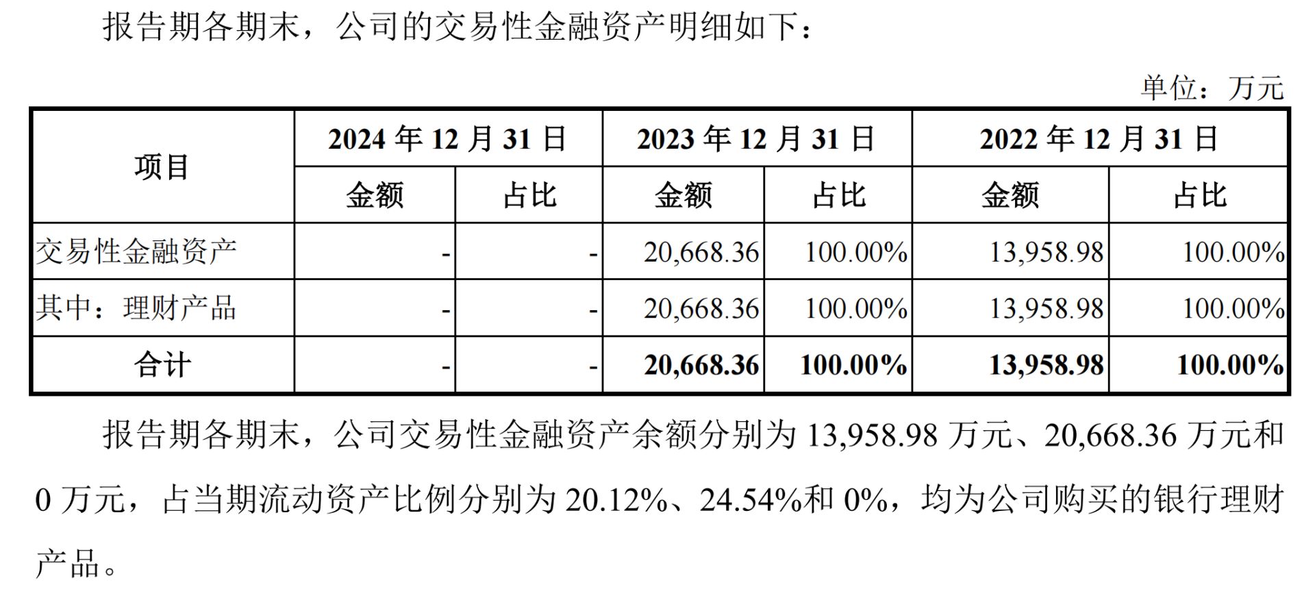 慧谷新材招股书显示,2022年末和2023年末,慧谷新材拥有理财产品分别为1.40亿元和2.07亿元,分别占到当期资产总额的5.94%和21.50%。到了2024年末,慧谷新材的理财产品则降到了0。