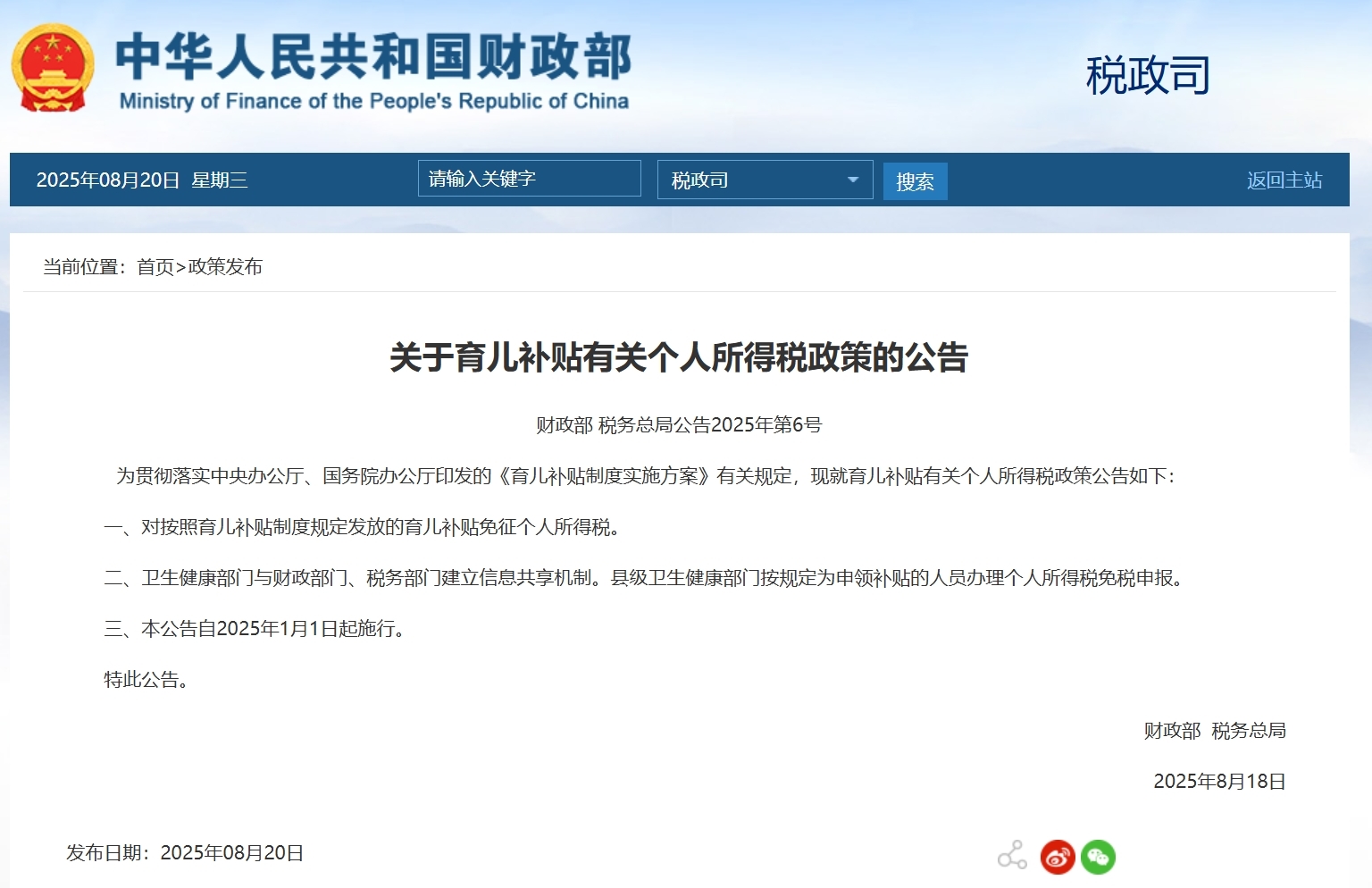 据财政部税政司官网8月20日消息,财政部、税务总局8月18日发布公告,为贯彻落实中央办公厅、国务院办公厅印发的《育儿补贴制度实施方案》有关规定,现就育儿补贴有关个人所得税政策公告如下: