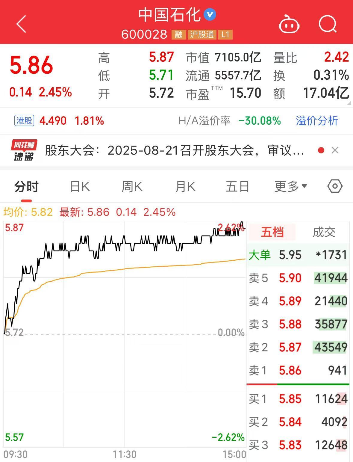 盘面上,截至A股今日收盘,中国石化股价涨2.45%,报5.86元,最新市值7105亿元。