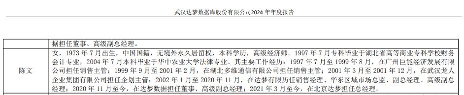 公司2024年报显示,陈文,女,1973年7月出生,本科学历,高级经济师。1997年7月专科毕业于湖北省高等商业专科学校财务会计专业,2004年7月本科毕业于华中农业大学法律专业。2002年1月至2020年11月,在达梦有限历任销售经理、华东区域市场总监、副总经理、高级副总经理;2020年11月至今,在达梦数据担任董事、高级副总经理;2021年3月至今,在北京达梦担任总经理。