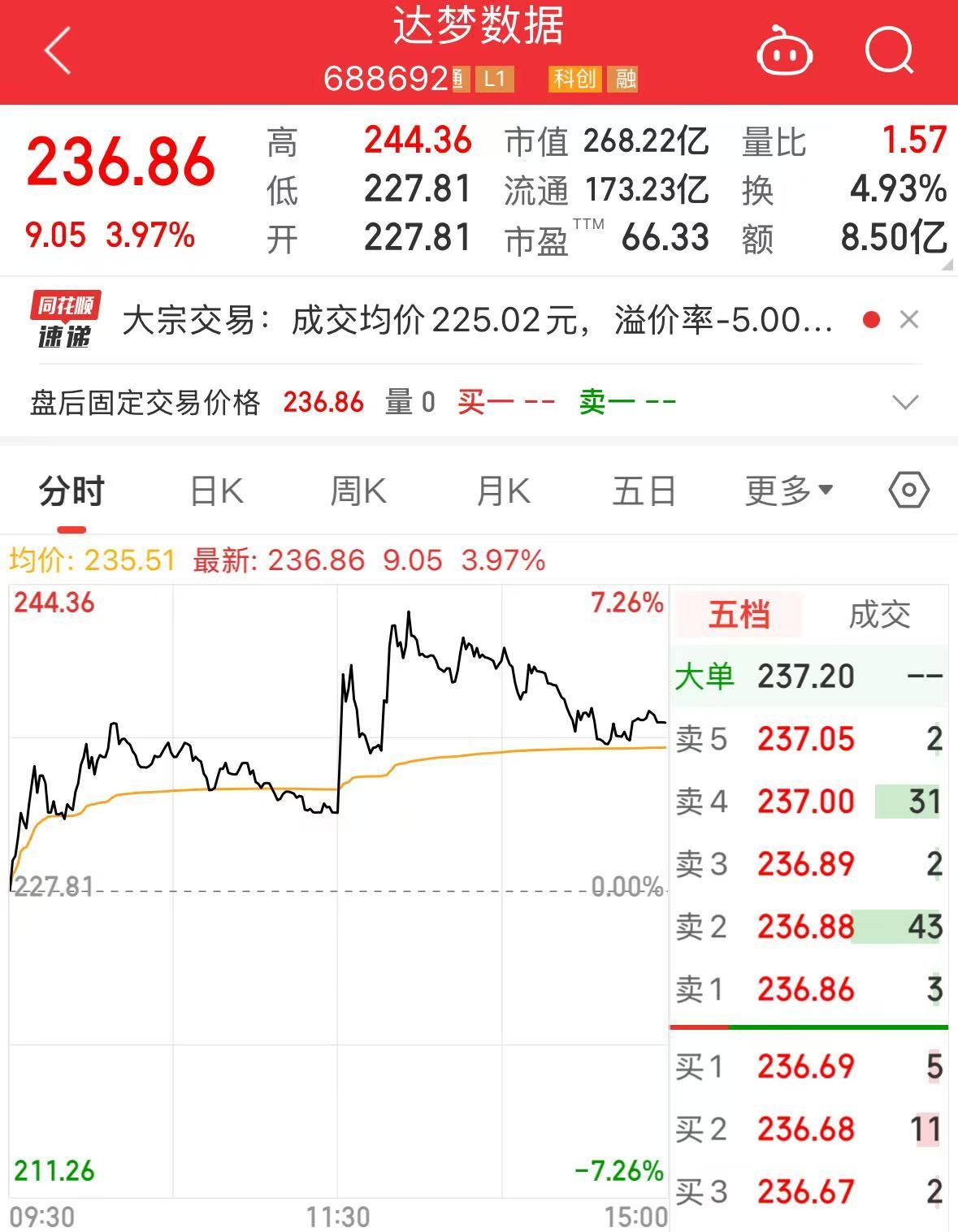 市场方面,截至今日收盘,达梦数据涨3.97%,报236.86元,总市值268.22亿元。