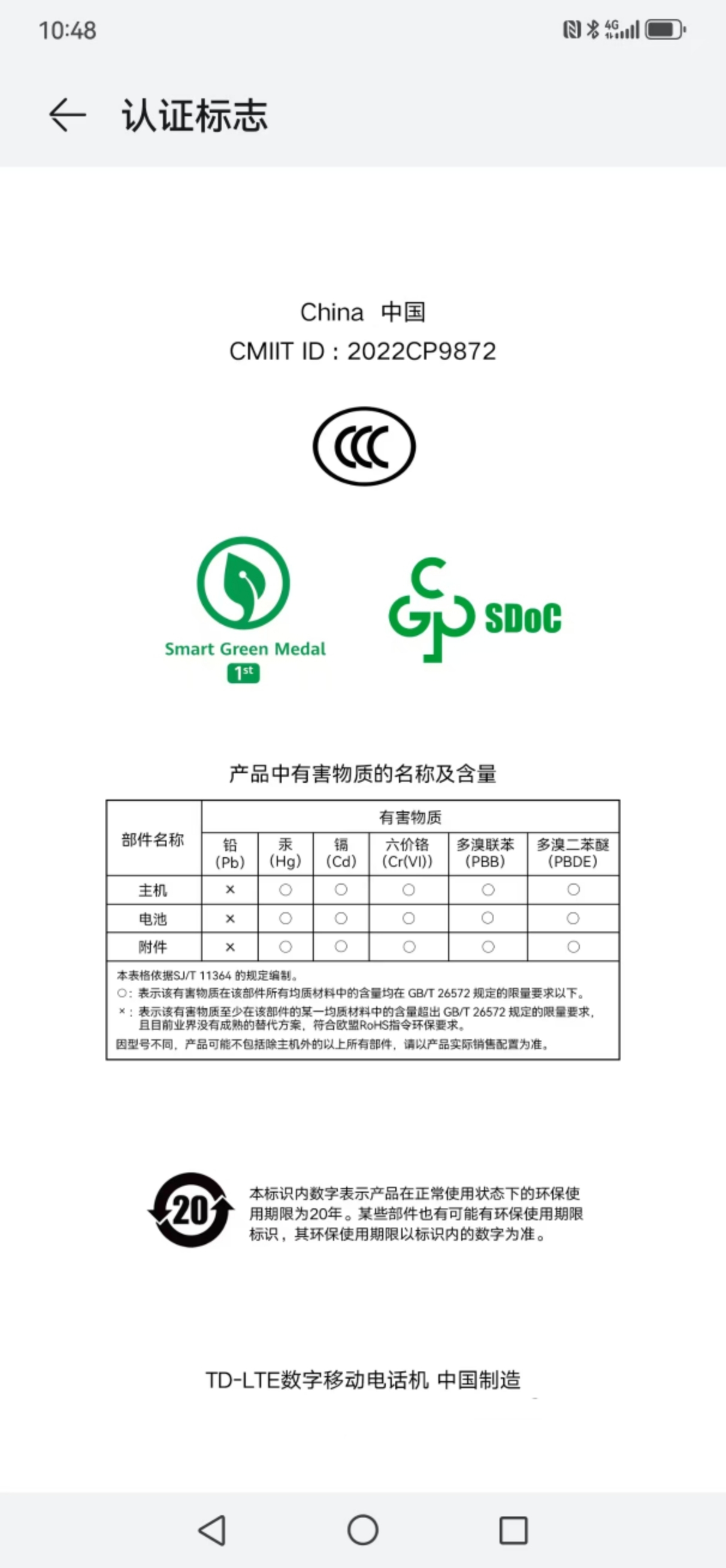 “产品的标识要求听起来可能有一点复杂,下面以我的手机为例,展示下相关标识。”郭楠表示:“在手机里的设置—系统—认证标志板块即可查看。这是手机相关页面的放大图,下面这个圆形的图标是‘电器电子产品有害物质限制使用’标识,圆圈里的数字就代表产品的环保使用期限。中间的表格就是产品有害物质含有情况表,目前里面只有铅、汞等6种有害物质,后续会增加至10种。上面这个由英文字母CGP组成的绿色小树标,就是中国绿色产品标识,按照市场监管总局发布的《绿色产品标识使用管理办法》统一样式。CGP是中国绿色产品英文的首字母,标识右侧的SDOC(Supplier's Declaration of Conformity)表示产品是通过企业自我声明的方式完成的合格评定。”