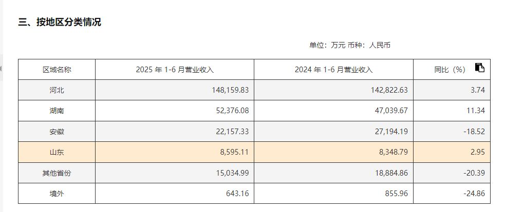 今年上半年,河北市场实现营收14.82亿元,同比增长3.74%,为公司贡献了近六成营收;湖南市场则成为其营收增速最快的市场,实现营收5.24亿元,同比增长11.34%;相比之下,安徽市场则成为营收下滑最多的市场,营收同比下滑18.52%至2.22亿元。