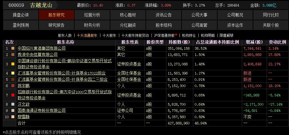 值得一提的是,虽然业绩未出现明显增长,但古越龙山还是得到了社保资金的强烈关注。根据中报披露数据,截至6月30日,汇添富基金管理股份有限公司—社保基金17022组合、汇添富基金管理股份有限公司—社保基金四二三组合,分别以持股1156.34万股、825.34万股新进成为该公司第四和第五大流通股东。