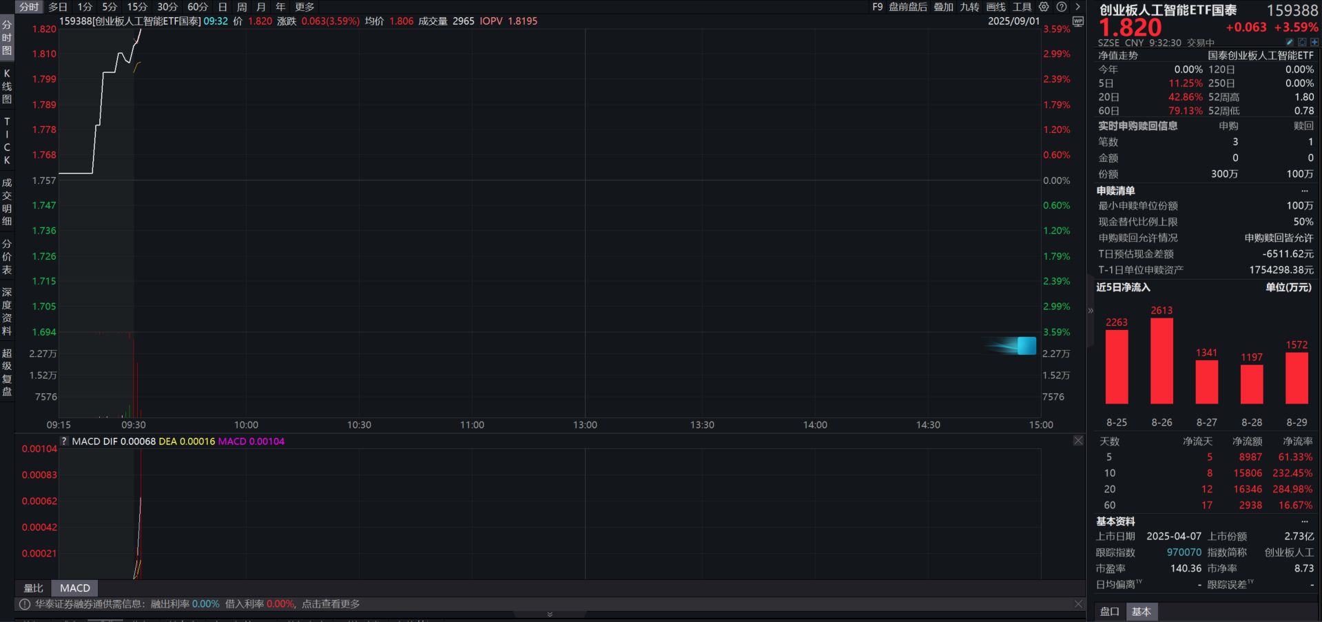 9月1日开盘,受近期人工智能板块定期报告利好提振,创业板人工智能ETF国泰(159388)开盘拉升超3%,资金积极布局,连续5日净流入。