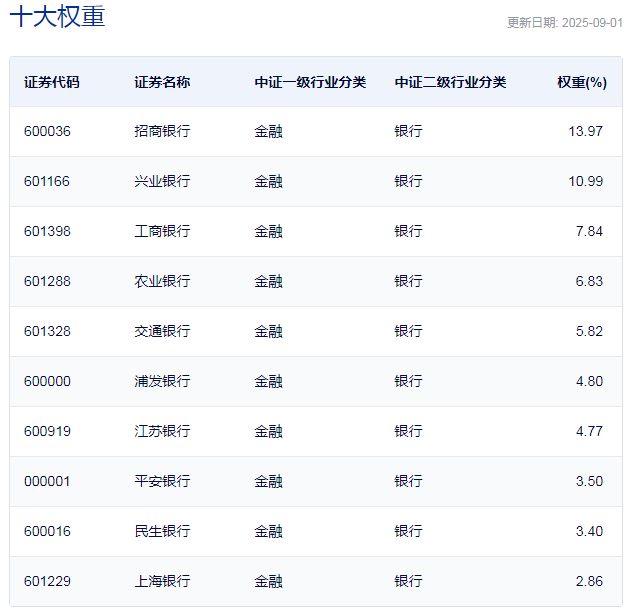 中证银行指数发布于2013年7月15日,为反映中证全指指数样本中银行行业公司证券的整体表现,为投资者提供分析工具。成分股分布于银行业,平均市值较大,持仓集中度较高。