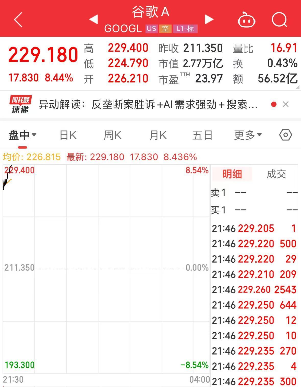 北京时间9月3日晚,谷歌公司股价盘初大涨7%,刷新历史新高,总市值达到2.75万亿美元。截至发稿,谷歌A股价涨超8%,报229.18美元,总市值达到了2.77万亿美元。