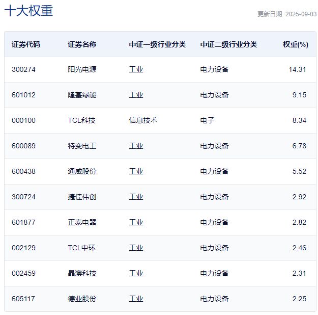 中证光伏产业指数(931151.CSI)发布于2019年4月22日,从沪深市场主营业务涉及光伏产业链上、中、下游的上市公司证券中,选取不超过50只最具代表性的上市公司证券作为指数样本,以反映沪深市场光伏产业上市公司证券的整体表现。