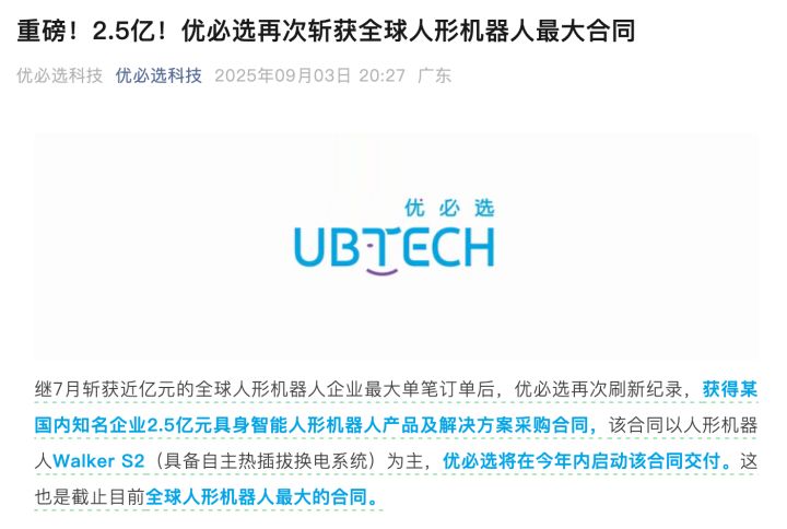 2.5亿元的合同,在外行人眼中,这对一家近500亿港元市值的上市公司来说,可能并不算太劲爆。但你可能不知道,这是截至目前,全球人形机器人最大的一笔单一订单。
