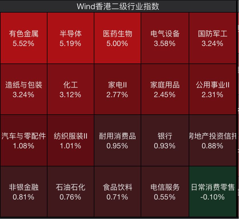 盘面上,光伏太阳能、半导体、有色金属、医药生物、电气设备、国防军工等板块反弹力度最强。从Wind香港二级行业指数来看,仅有日常消费零售指数小幅回落。