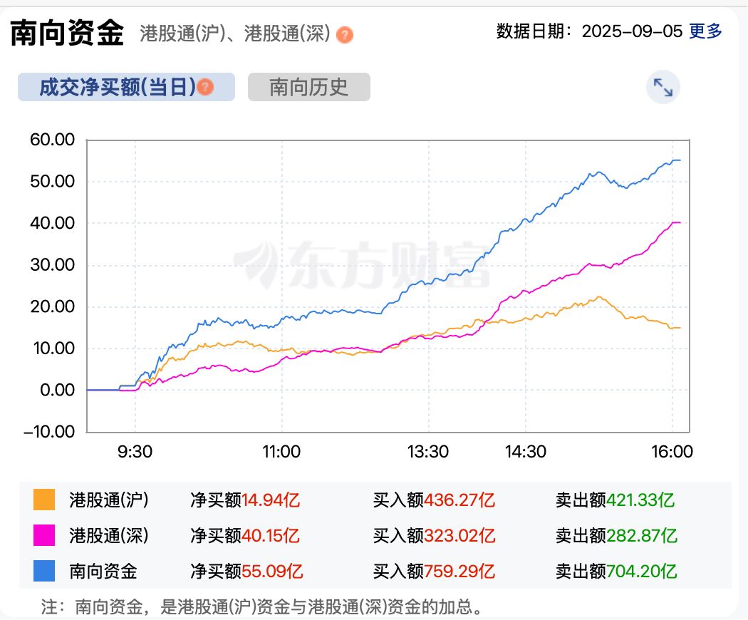 资金方面,南向资金今日继续大举买入港股。截至收盘,港股通(沪)净买额14.94亿港元,港股通(深)净买额40.15亿港元,合计净买入达55.09亿港元。