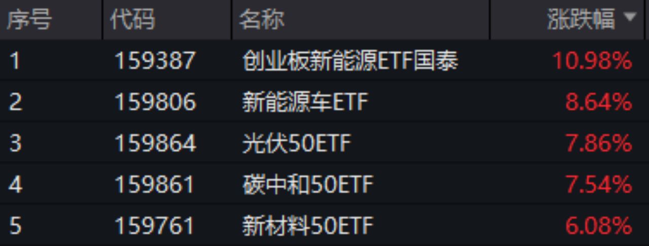 新能源板块迎来了“春天”。其中,创业板新能源ETF国泰(159387)大幅上涨10.98%,新能源车(159806)上涨8.64%,光伏50ETF(159864)上涨7.86%,碳中和50ETF(159861)上涨7.54%。