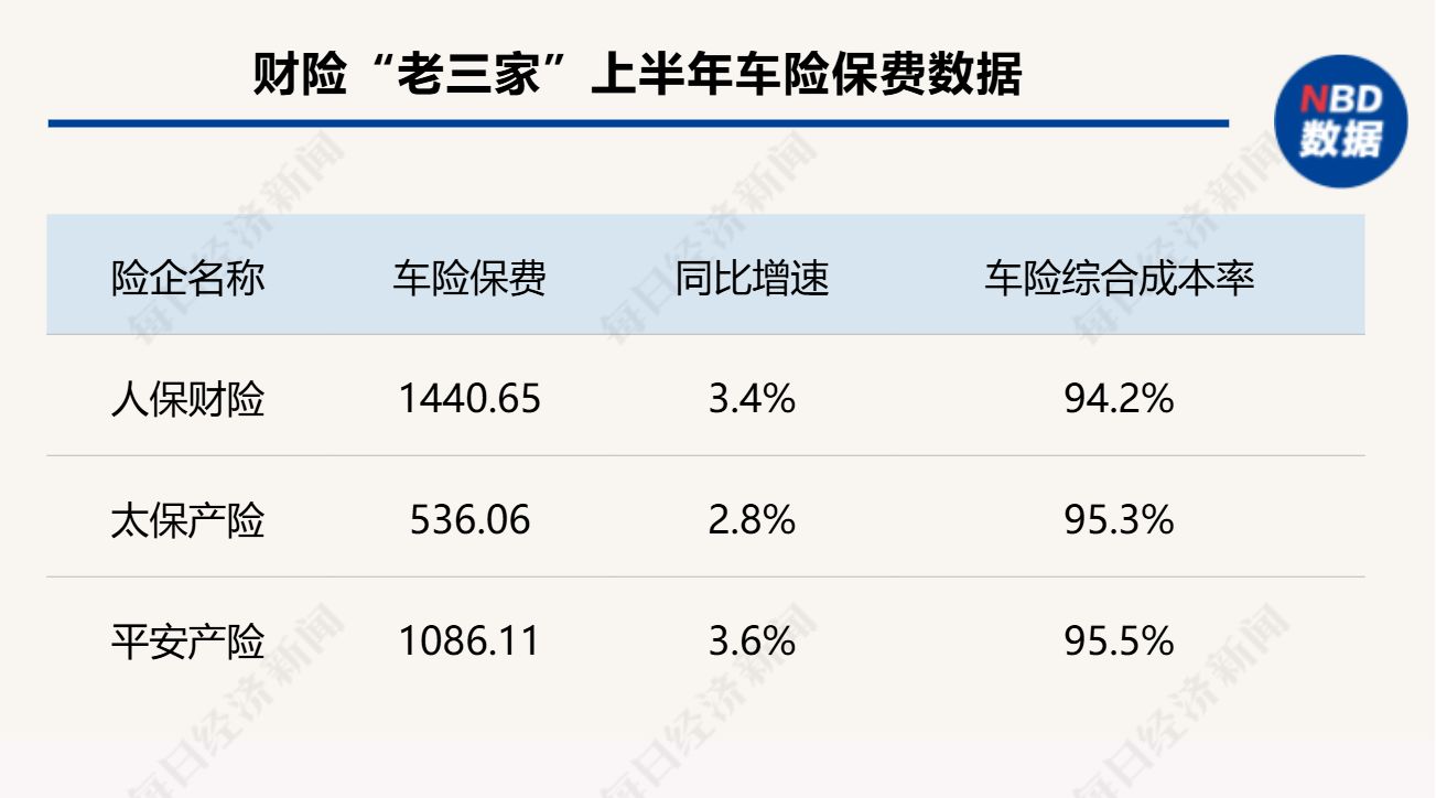 半年报数据显示,人保财险、平安产险、太保产险上半年分别实现车险保费收入1440.65亿元、1086.11亿元、536.06亿元,分别同比增长3.4%、3.6%、2.8%。