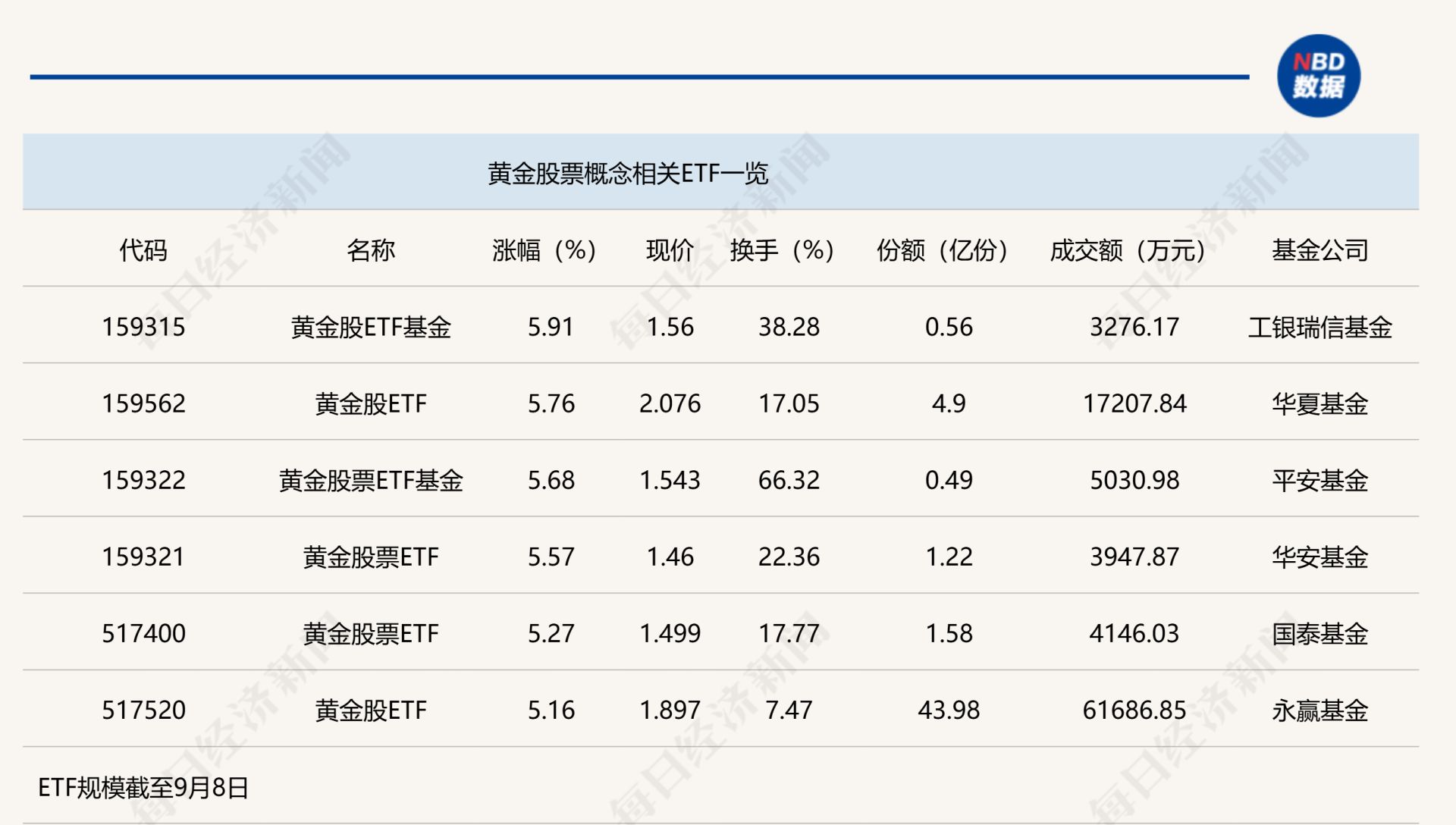 今日上午,证券行业ETF交投活跃,多只证券ETF成交量巨大。同时,黄金股概念ETF涨幅居前,6只相关ETF半日涨幅超5%,主要受美国就业数据疲软及通胀预期影响,市场对美联储9月降息信心增强,金价获提振。其中,黄金股ETF(517520)半日成交金额高达6.17亿元,追踪的是发布于2017年的中证沪深港黄金产业股票指数。